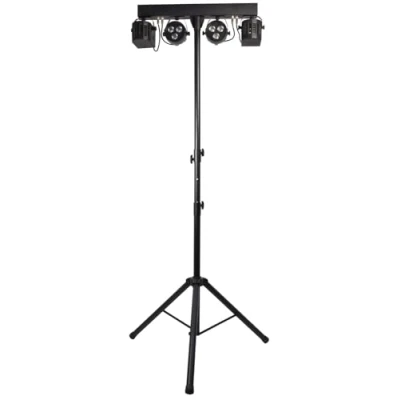 Lightweight portable solution for DJ's, events & parties lightin T-bar incorporates 2x RGBW PAR lights + 2x LED Derby effects 3, 6 or 15CH DMX compatible Supplied with a 2.3 metre telescopic tripod stand, wireless remote control, 3 metre power cable & carry bag