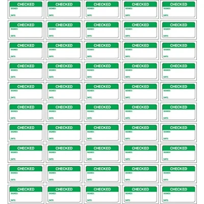 Quality control labels Checked signed and date 250 Stickers 40mm x 20mm Remove backing film and apply to dry, smooth, oil free surface. Supplied in sheets of 25