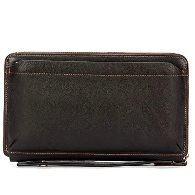 QUEAMBLER Real Leather Clutch Bags for Men Large Zip Around Genuine Purse Vintage Retro Checkbook Handbag Coffee