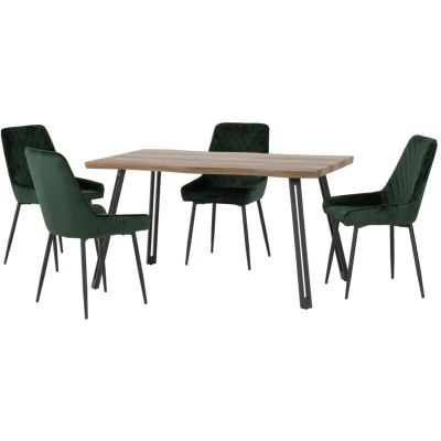 General description The Quebec Wave Edge Dining Set with Avery Chairs combines modern design with functionality, featuring a medium oak effect finish complemented by black and emerald green velvet accents. Technical specifications Table Dimension: L80 x W140 x H76 cm Chair Dimension: L59 x W48 x H90 cm Total Weight: 34.78 kg Materials: Composite board, metal, 3D paper veneer, velvet fabric, foam, plywood, non-woven