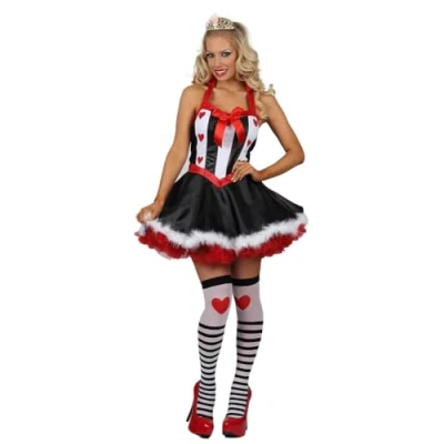 COMPLETE SET: Includes a beautifully designed dress with heart motifs, a matching crown, and coordinating striped stockings in black, red, and white colours DRESS DESIGN: Features a fitted bodice with heart patterns, red bow accents, and a full skirt trimmed with white feather embellishments ELEGANT DETAILS: Halter-style neckline with red ribbon trim, contrasting black and white striped pattern, and heart embellishments throughout MATCHING ACCESSORIES: Comes with striped knee-high stockings featuring heart details and a decorative crown to complete the royal look COSTUME STYLING: Perfect combination of classic playing card queen elements with a modern, fashionable twist in a flattering silhouette, Manufacturer: Classified