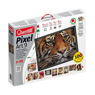 For both adults and children, PIXEL ART is the 2.0 version of the traditional Quercetti pins Choose the image from the Pixel art Gallery catalogue; print the pattern, position it on the perforated template and insert the pins Version with 9 templates, a frame and many 4mm diameter pins The pins come in only 6 colours, but seen from a certain distance they blend and the compositions seems a real photograph Safely Made in Italy, Manufacturer: Quercetti