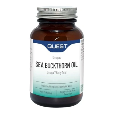 SOURCE OF OMEGA 3,6 &7: Sea buckthorn oil is a rich complex of monounsaturated fatty acids including omega 3, 6 & 7. Sea buckthorn oil is also a rich source of alpha and beta carotene and vitamin E. SUPPORTS EYE & SKIN HEALTH: It is high in antioxidants and has anti-inflammatory properties. Sea buckthorn oil nourishes the delicate mucous membranes particularly in the eye. Sea buckthorn oil also aids with the skin, and is used therapeutically with Eczema atopic dermatitis, ulcers, wounds and burns. POST MENOPAUSAL: Sea buckthorn oil is often taken for post-menopausal for vaginal dryness and atrophy, the thinning and drying of the vagina characterised by discomfort, feelings of dryness, burning and itching. It benefits the mucus membranes in many ways, being rich in vitamin E, alpha & beta carotene, which is converted to vitamin A in the body, an essential fat-soluble vitamin for the health of mucous membranes. INGREDIENTS: Our formula is suitable for Suitable for Dairy-Free, Gluten-Free, Nut-Free, Vegans, and Vegetarians. Take two capsules daily with food. Ingredients include Sea Buckthorn oil, Modified Corn Starch, Glycerol, Capsule Shell (carrageenan), Sodium Carbonate. QUEST: A leading British manufacturer of high-quality nutritional supplements, with over 30 years of experience in the industry. Our commitment to quality and innovation has earned us a reputation for producing exceptional products that promote overall health and well-being. By using the latest scientific research and state-of-the-art manufacturing facilities, Quest delivers safe, effective, and reliable supplements to help you achieve your health goals.