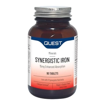 HELPS REDUCE TIREDNESS: Quest Synergistic Iron provides iron, vitamin C, vitamins B2, niacin, B6, B12, pantothenic acid and folic acid which contribute to the reduction of tiredness and fatigue plus normal energy-yielding metabolism. Our iron supplement for men & women is sure to make you feel active & energetic throughout the day! RED BLOOD CELL PRODUCTION: Iron plays a role in the transport of vital oxygen around the body and in the formation of red blood cells. Iron also aids with the formation of haemoglobin that transports oxygen around your body. Iron supplementation also supports focus, the immune system, and can improve muscle endurance. USE FOR ANEMIA, PREGNANCY OR PERIODS: Women of child bearing age have a higher risk of low iron levels due to the menstrual cycle. Iron supplementation is recommended to prevent iron deficiency anaemia in pregnancy, boost iron levels when on your period or for men and women with ion deficiency anemia. BIOAVAILABLE SYNERGISTIC FORMULA: The Quest Synergistic Zinc stands out with its chelated mineral form for optimum absorption and utilisation with 11 additional nutrients to enhance the utilisation and activity of iron. Crafted from premium natural ingredients, it's gentle on the stomach and suitable for a wide range of dietary preferences including vegan, gluten free, nut free and dairy free! ABOUT QUEST: At Quest, our mission is to provide high-quality, innovative health supplements that support your quest for wellbeing. With over three decades of expertise, we strive for excellence in nutritional science, ensuring all our products are backed by comprehensive research. Trust in Quest for your health journey.