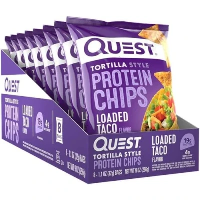 Enjoy more. Less Carbs: Quest Loaded Taco Tortilla Style Protein Chips offer the crispy, satisfying flavor of a regular tortilla chip. Only ours contain 19g of protein and 4g of net carbs per sachet. Bite into Complete Protein: Taco Tortilla Quest Loaded Style Protein Chips are made from complete dairy-based protein to provide your body with 9 essential amino acids Salty, delicious, crunchy: The Quest Loaded Taco Tortilla Style Protein Chips are perfectly seasoned and contain no additional soy ingredients. Bake, never deep-fried: Quest Loaded Taco tortilla-style protein chips are baked to give you the satisfying crunch you crave without adding oils to your chips Chips you take with you: Take Taco Tortilla Quest Loaded Protein Chips in your backpack, purse, car console, gym bag, or wherever your adventures take you.