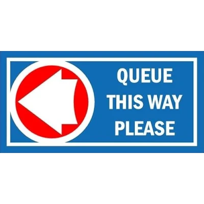 Queue this way, arrow pointing left. Self adhesive sticker. Printed using the latest digital technology and laminated for extra durability. Remove backing film and apply to dry, smooth, oil free surface. All signs come with a 5-year warranty. All our signs are UV resistant meaning they will not fade in sunlight. Our vinyl stickers are temperature resistant from -40°C to +80°C.