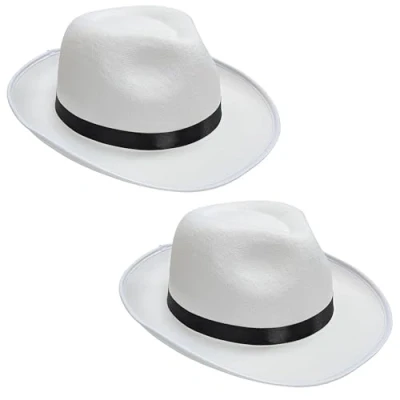 GANGSTER HATS : Pack of 2 white trilby-style hats with sleek black ribbon band – ideal for 1920s speakeasy parties, Great Gatsby nights, and Al Capone-style mafia costumes AUTHENTIC LOOK : Classic trilby silhouette and contrasting black band evoke iconic film noir detectives and Prohibition-era gangsters ONE SIZE FITS MOST : Comfortable and lightweight design with approx. 56cm internal circumference – suitable for most adult heads PERFECT FOR EVENTS : Great accessory for group costumes, murder mystery parties, themed weddings, theatre shows, and photo booths DURABLE DESIGN : Made from moulded white velour-style material for a smooth finish and lasting shape throughout your event, Manufacturer: Quickdraw