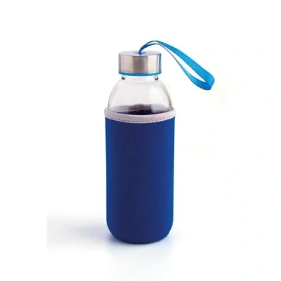 400 ML GLASS BOTTLE WITH STAINLESS STEEL CAP AND QUIDATE BLUE NEOPRENE COVER Bottle for water, juices or glass soda 40 cl bottle easily transportable With removable neoprene sleeve and metal stopper with hanger handle Totally BPA free. Dishwasher Safe