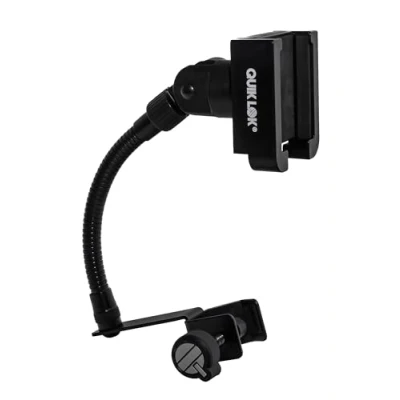 SMS/001 is Quik Lok developed smartphone mount for microphone stand, perfect for reading song lyrics, recording your performance from a narrow angle, or recording all the audience's reactions to any live performance. With this universal holder, your smartphone is always at hand. The mount is suitable for all flat devices with a width of 51 to 85 mm. Application is quick and easy. Attach your smartphone with the lever on the right or left jaw and with the other hand the opposite jaw to release the entire system to hold your smartphone securely without damaging the edge of your mobile phone. Thanks to the rear joint, the holder can be tilted up and down and rotated 360°. The flexible gooseneck retaining arm with a length of 140 mm offers an additional adjustment option for optimal mounting points. The clamp on the base allows you to screw the smartphone mount to any microphone stand with tube diameter of 30mm or smaller. The smartphone holder can be unscrewed from the gooseneck and attached directly to a microphone stand with the standard 5/8 inch thread.