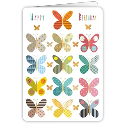 Fresh, contemporary design, foiled and finished with rounded corners Individually cello wrapped and supplied with a co-ordinated envelope Card Text : Happy Birthday Envelope Colour : Silver or Gold Finishing : Foiled + Rounded Corners