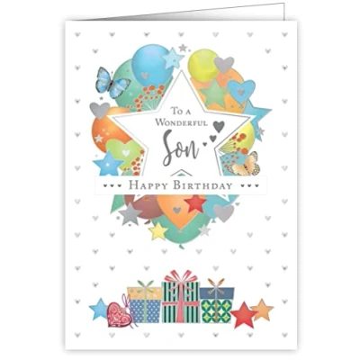 Foiled, embossed and individually cello wrapped Blank inside Card Text : To A Wonderful Son / Happy Birthday Envelope Colour : Cream