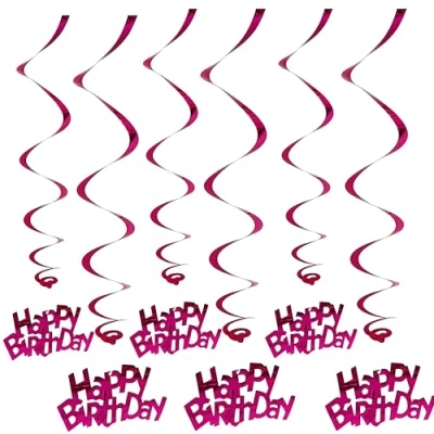 Quirki Happy Birthday Hanging Party Decorations (6 pcs) Swirl Spiral Foil Streamers (Pink)