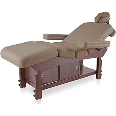 Stretcher for SPA and Wellness in wood finishes adjustable in height. Tilt adjustable backrest, central fold, folding armrests and bottom shelf partly covered sliding doors on both sides. Quality finishes, great versatility and high storage capacity are the main characteristics that define this stretcher from SPA and Wellness.