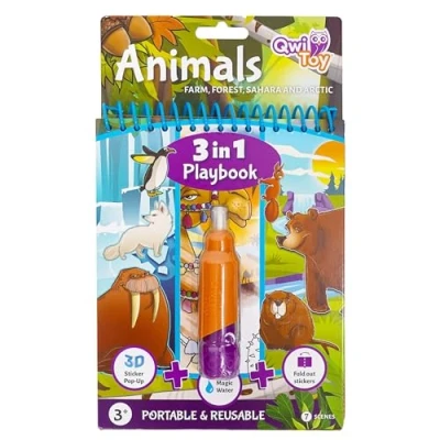 QwiToy 3 in 1 Game Book, Activities, Colouring Book with Water Magic Pen, Openable Scenes Stickers, 3D Pop Up Scenery Puffy White
