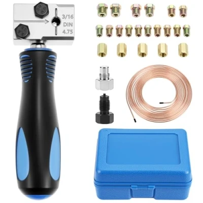 Brake line flaring tool: Brake line flaring tool for 3/16 inch DIN flaring, made of quality carbon steel, high hardness and not easy to deform. Copper-Plated Brake Line: This 3/16" x 25'/7.6-meter copper-plated brake line features a rust-resistant copper coating. It offers enhanced strength and toughness and includes 16 nuts and 5 connectors. Easy to Use: The brake flaring tool comes in a sturdy tool case for easy transportation and storage. Handle: The handle of the brake flaring tool features a plastic coating for a non-slip, non-loosening effect. Widely Used: Can be used in hydraulic lines, fuel lines or brake lines, etc, Weight: 2.3368999772 Pounds, Manufacturer: QWORK
