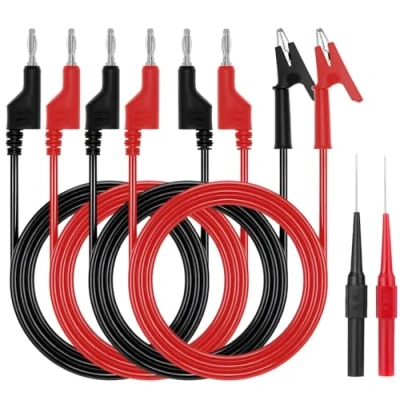 Comprehensive Set: Includes 2 banana plug test leads, 2 alligator clip leads, and 2 0.7mm test probes for versatile testing applications. Material: Insulated PVC and copper wire, ensuring durability, reliability and safety during electrical and electronic testing. High capacity leads: support up to 1000V/15A for robust testing with your multimeter and other test equipment. Practical Design: Stackable 4mm plugs and 1-meter wire length provide flexibility; non-slip design ensures secure connections. Widely used:Ideal for multimeter applications, electrical power testing, quick assembly circuits, and electromechanical power projects.