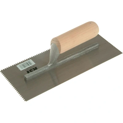 General description This RST V Notch Trowel is designed for spreading adhesive when laying tiles, carpet, or other flooring materials. It features 5mm V-shaped notches that create a continuous zig-zag pattern, ensuring an even application of adhesive. The trowel is equipped with a durable wooden handle for a comfortable grip and precise control during use. Technical specifications Blade Size: 280 x 115 mm (11 x 4.1/2 in) Notch Size: 5 mm V notches Material: Spring steel Part Number: RTR153DT EAN: 5013693815337 Compatibility and accessories Compatible with tile adhesives, flooring adhesives, and similar materials Can be used with other trowel sizes and notch types for various applications Installation Hold the trowel at a 45-degree angle to the surface Spread adhesive evenly across the surface using the notched side Ensure a consistent notch pattern for proper adhesion Usage Apply adhesive to the surface in sections Use the notched side to create uniform ridges for optimal bonding