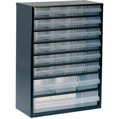 General description The Raaco 928-123 Metal Cabinet is a versatile storage solution featuring 28 assorted drawers, perfect for organizing small items. Made of painted steel with durable polypropylene (PP) drawers, this cabinet is designed for both wall mounting and placement within a rotating tower, making it ideal for workshops, garages, or storage rooms. It includes a stop edge to prevent drawers from falling out and adjustable dividers for customizable compartments. Technical specifications Material: Painted steel frame with polypropylene drawers Number of drawers: 28 (24 small, 3 medium, 1 large) Drawer dimensions: 24 x 150-01 (41 x 67 x 153mm), 3 x 105-02 (64 x 91 x 154mm), 1 x 150-03 (64 x 279 x 155mm) Load Capacity: 26.4kg Overall dimensions (H x W x D): 417 x 306 x 150 mm Weight: 3.8kg Compatibility and accessories Compatible with wall mounting or can be used within a rotating tower system Includes dividers for multiple compartments within drawers Installation Designed for