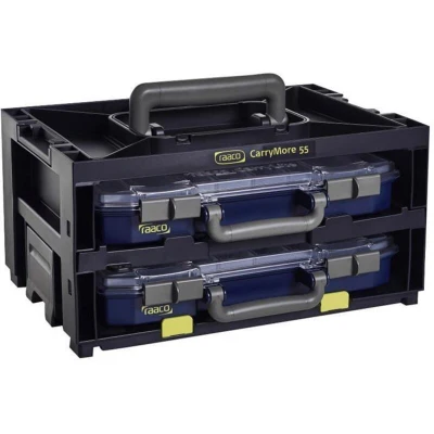 General description The Raaco CarryMore 55x2 Storage System is a versatile and efficient storage solution that includes the CarryMore 55 black unit along with two CarryLite 55 4x8-16 Assorters. It is designed for easy transportation and organization of various items. Technical specifications Max Load: 25kg Dimensions (DxWxH): 278 x 386 x 195mm Weight: 3.6kg Material: Polypropylene and copolymer (PP and CO) Compatibility and accessories Includes 2 CarryLite 55 4x8-16 Assorters Each Assorter contains 16 inserts: 2 x A7-1, 4 x A8-1, 2 x A8-2, and 8 x A9-1 Installation Equipped with an ergonomic handle for easy carrying Features a connecting lock-mechanism to link multiple units together Usage Retainers prevent CarryLite boxes from falling out during transportation