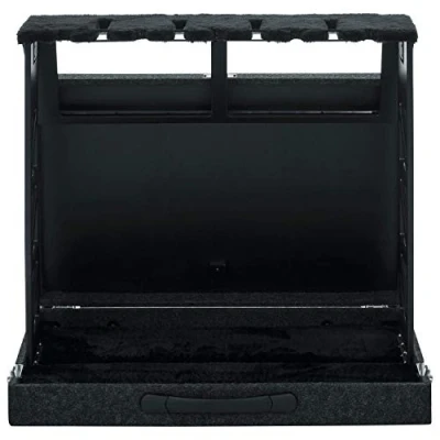 Compact rack style guitar stand case holds up to (4) acoustic, Electric or bass guitars Stand section locks into place with recessed twist latches Elastic secure bands keep guitars from sliding out if stand is bumped Plush lined interior, with birch wood construction with grey carpeted exterior covering Commercial grade, penn-elcom twist latches and hardware and feet on bottom to prevent wear during use