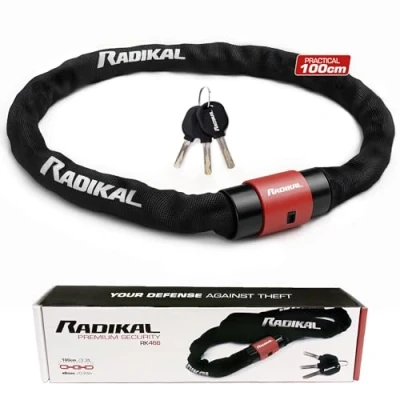 SECURITY AND CONFIDENCE GUARANTEED: The RADIKAL anti-theft lock offers protection thanks to its hardened steel chain of 6 mm diameter that is cut and tamper-resistant. Includes 3 security keys, reversible for your convenience. It has an attractive black and red design with visible RADIKAL branding and a deterrent effect, providing peace of mind on your urban commute. LIGHTWEIGHT PROTECTION AND EASY TO CARRY - The RADIKAL RK466 anti-theft chain has been designed with your comfort in mind. Flexible steel chain to be rolled with light weight and compact size make it incredibly easy to transport on your bike, scooter or motorcycle, allowing you to carry it with you in comfort on every ride. EASY TO USE AND HIGHLY COMPATIBLE: The 360° swivel lock allows you to open and close quickly in any position. With 100cm length it is fully compatible with bicycles, electric scooters, scooters, machinery, etc. offering maximum versatility without sacrificing safety or practicality. SUPERIOR QUALITY AND DURABILITY: Made from quality materials, it has a protective sleeve that prevents scratches on your belongings. This anti-theft lock is made with durable materials to stand the test of time. Its protective cap prevents the ingress of water and dust, prolonging the life of the closure and keeping the security intact in any circumstance. PREMIUM SECURITY BRAND: RADIKAL is specialized in padlocks approved by the CLASSE SRA in France, the most demanding market in the world, as insurers request the best approved padlocks. RADIKAL has been designing and manufacturing high quality anti-theft products in Europe since 2010., Weight: 1.84306451032 Pounds, Manufacturer: Equiptomor Locomotion Direct S.L