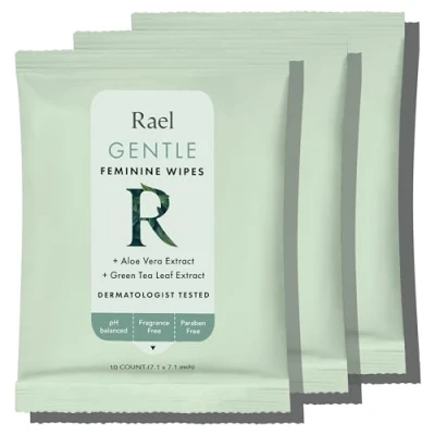 Rael Flushable Feminine Intimate Wipes pH Balanced, Unscented, Aloe Vera Extract, Safe for Sensitive Skin, Vegan & Cruelty Free, Travel Size (10 Count, Pack of 3)