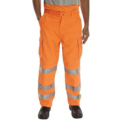 Railspec trousers 280gsm 80-20 polyester cotton Teflon treatment coated for improved soil release Durable hard wearing whilst remaining soft and comfortable Triple sewn seams for extra strength 7 Belt loop waistband 2 x cargo pockets Knee pad pockets 3 x 3M Scotchlite - Retro-reflective leg bands Tall and short leg option available EN ISO 20471 Class 2 high visibility RIS-3279-TOM - Railway use certified.