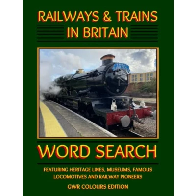 Railways and Trains in Britain Word Search GWR Colours Edition: Steam Locomotive names, UK Heritage Lines Stations, Museums Railway Pioneers