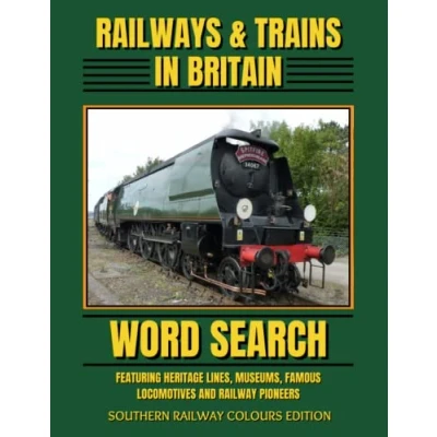 Railways and Trains in Britain Word Search Southern Railway Colours Edition: Steam Locomotive names, UK Heritage Lines Stations, Museums Pioneers