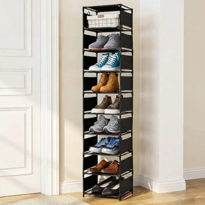 The Rainberg Narrow Shoe Rack has an adjustable feature that allows you to customize it according to your needs. Its space-saving dimensions make this shoe rack perfect for small spaces or apartments where maximizing storage capacity is essential. Ample Space: This shoe rack can hold up to 10 pairs of shoes, making it perfect for organizing your footwear collection. Dustproof Cover: The included dustproof cover ensures your shoes remain clean and protected from dust and other pollutants. Easy to Assemble: The rack can be easily assembled without needing special tools or equipment, making it a hassle-free addition to your home. Dimensions: Depth 28cm | Width 33cm | Height 158cm.Item weight: 2.0 kilograms
