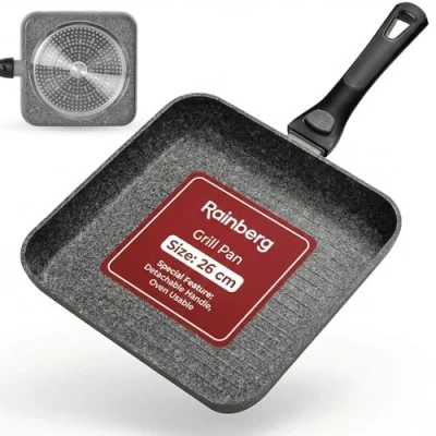 Rainberg 26cm Grill Pan with Detachable Handle, Granite Non Stick Coating, Griddle Pan, Induction Compatible, Also can be Used in The Oven.