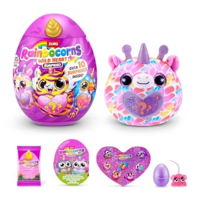 HUG TO HATCH – The magic starts with a hug! Squeeze to reveal your plush toy and all the surprises hidden inside—perfect for unboxing fun and playtime adventure. LONG TAILED BOO-BOOCORNS – Discover adorable Boo-Boocorns with fun, fuzzy long tails hiding in every egg—each one packed with personality. FUN EXTRAS INCLUDED – Enjoy colorful stickers and Rainbocorn poop slime to stretch the fun and spark imagination through sensory play. OVER 10 SURPRISES: Hug to hatch and discover more than 10 exciting and colorful surprises waiting just for you! COLLECT THEM ALL – With 7 wild plush designs to discover, Rainbocorns Wild Heart Surprise makes the perfect collectible for creative kids and toy lovers., Manufacturer: ZURU