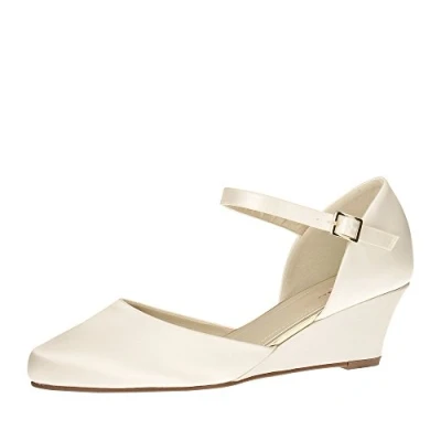 An elegant satin wedding shoe with ankle straps and a wedge heel for exceptional style and comfort Colour: Ivory and White | Outer material: Satin | Inner material: Synthetic | Heel height 5 cm Excellent as a shoe for Latin and ballroom dances Comfort fit, thanks to the inner foam lining Perfectly matching satin shoes for your wedding dress - Our dyeing experts can customise this white or ivory bridal shoe in any other colour of your choice