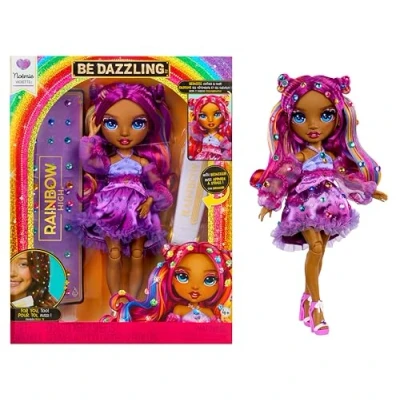 NOEMIE VIOLETTE DOLL: Noemie brings glamorous purple style, culinary creativity and whimsical charm to the Be Dazzling line; features glossy hair, real eyelashes, glass-like eyes and a layered purple outfit BEDAZZLING FUN: Includes an easy-to-use bedazzling tool and sparkling gems; customise her outfit and hair to reflect her love of detailed presentation and creative style POSABLE FOR STORY PLAY: Fully articulated at the head, arms and legs; pose Noemie decorating desserts, hosting imaginative dinner scenes or exploring travel-inspired ideas CREATIVE CULINARY BACKSTORY: Inspired by global flavours and cultures from her travels; Noemie brings humour, charm and artistic food styling to storytelling play WHAT'S INCLUDED: Includes 28cm doll, purple outfit, shoes, bedazzling tool, gems, comb and accessories; collect the Be Dazzling squad to expand your Rainbow High collection, Manufacturer: MGA Entertainment