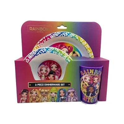Official Rainbow High 3 Piece Dinnerware Set. Our reusable bowl, plate and bowl are perfect for making meal times fun! Includes one dinner plate, one bowl and one tumbler - everything you need for breakfast, lunch or dinner featuring Bella, Poppy, Sunny, Jade, Skyler, Violet & Krystal Made From High Quality, Durable & Dishwasher safe plastic, this robust resusable set will last for many years