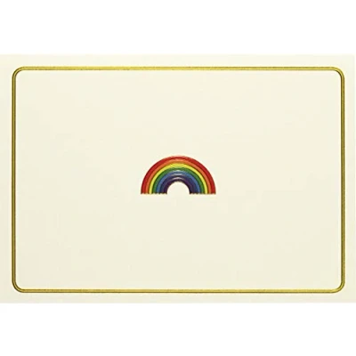 righten their day with a personal note and a beautiful Rainbow card! Premium boxed stationery set comes with 14 note cards and 15 envelopes. Note card interiors are blank for your personal messages. Smooth-finish uncoated card stock takes pen beautifully. Card exteriors feature a crisp linen-like finish. Embossed rainbow design is embellished and framed with gold foil. Matching stationery envelopes complete the set. Cards are suitable for a variety of occasions. Note card set is suitable for gift-giving. Cards measure 5'' wide x 3-1/2'' high. Cards come in a matching board box with a clear acetate lid.