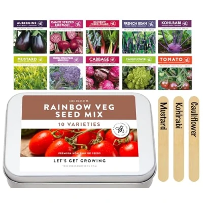 10 RAINBOW VEGETABLE VARIETIES - Cauliflower, french bean amethyst, chard rainbow, beetroot chioggia, red cabbage, kohlrabi, mustard golden streaks, aubergine black beauty, tigerella tomato & purple sprouting broccoli, it's just the variety of seeds you need for your garden! SAVE YOUR SEEDS -You can save Rainbow seeds, they are not only guaranteed to taste better but you can also save the seeds produced each year so they can be planted again, saving money. GROWING GUIDE - Our Rainbow Vegetable Growing Guide is included in this pack, so even if you’re a beginner, you’ll have no problem getting started, with these easy to use instructions showing you how to sow, when to harvest and the best planting companions. EASY TO SOW: Whether in a vegetable bed in the garden or allotment, or a plant pot indoors or on a balcony, you will find easy to use instructions in our growing guide on how to sow and harvest and the best planting companions. FRESHEST SEEDS! Packed in 2025 and ready to transform your meals with pure HomeGrown flavour. No pot of gold at the end of this rainbow, just a regular supply of the most colourful veggies your plate has likely seen (save any seeds and grow more next year!)