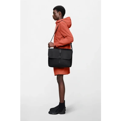 WATERPROOF LAPTOP BAG: Messenger Bag upgrades the classic city staple with statement straps and signature components. This functional waterproof bag offers ample space in a compact and commuter-ready silhouette. Lifting the flap reveals a single main compartment and soft-lined laptop pocket, ideal for devices up to 16”. FEATURES: Soft-lined pocket fits 16” laptop, signature carabiner closure, flap with magnet snap fastenings, coated tonal zip closures, single main compartment with zip, internal zipped pocket, external pocket with coated zip closure and detachable adjustable shoulder strap with comfort-pad. This product is designed to withstand light to moderate weather conditions RAINS SIGNATURE DESIGN: This laptop bag has a water column pressure of 8000mm, and made of 100% polyester with Rains signature PU fabric (polyurethane) as coating. It's is engineered for carrying strength, durability, and a smooth feel. ABOUT US: Rains is an outerwear lifestyle brand. Its collections blend a conceptual-meets-functional design approach, a strong urban inspiration, and a signature fabric identity. A coated waterproof fabric palette inspired by Rains’ first design – a contemporary reinterpretation of the classic rubber raincoat. Rains brings its neo-Scandinavian aesthetic, unisex collections, and consistently surprising curation to consumers across four continents.