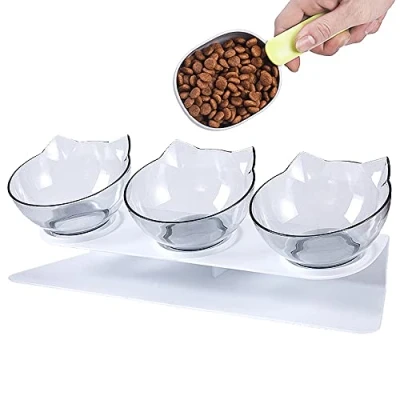 Raised Cat Bowl with Stand, Tilted for Kitten Elevated Anti Vomiting Plastic Transparent Food Water Bow (Three Bowls)