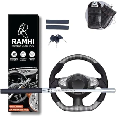 🛡️ MAXIMUM SECURITY & THEFT PREVENTION: Protect your vehicle with our heavy-duty steering wheel lock, designed to deter thieves and prevent car theft. The high-strength steel construction ensures durability and long-lasting protection. 🔗 ADJUSTABLE & UNIVERSAL FIT: Easily extendable this anti-theft lock fits 99% of vehicles, including cars, SUVs, and trucks with steering wheel lock 🔐 SIGNAL BLOCKING KEY POUCH: Comes with a special RFID-blocking pouch to protect your car key fob from relay attacks and key cloning, keeping your vehicle safe from high-tech thieves. ⚡ QUICK & EASY TO USE: No complicated installation required! Simply lock and secure your steering wheel in seconds. The bright yellow color acts as a strong visual deterrent to thieves. 💪 HEAVY DUTY & DURABLE BUILT: Made with high-strength steel and coated with anti-rust material, ensuring maximum durability and resistance to cutting or tampering., Weight: 2.19800875214 pounds, Manufacturer: RAMHI