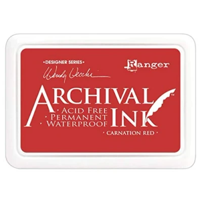 Wendy Vecchi - Archival Ink Pads Carnation Red Archival Ink Pad. Archival Inks provide long lasting results and are permanent on many surfaces. Create crisp, waterproof stamped images that wont bleed when used with waterbased inks. All colors are available in standard no.0 sized ink pads and coordinating .5 oz. re-inkers. 12 Facing Wire Display available (includes 3 each of all 12 colors) AID41399 MPN AID41399