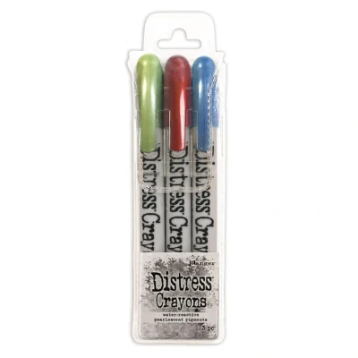 Distress Pearl Crayons Holiday Set 3 (Includes Fresh Balsam, Tart Cranberry & Winter Frost) Add colourful, pearlescent shimmer to paper crafts or mixed media projects with new Limited Edition Tim Holtz Distress® Pearlescent Crayon Sets for the Holidays Distress Holiday Pearlescent Crayons are formulated to achieve shimmery, vibrant colouring effects on porous surfaces. The smooth water reactive pigments are ideal for creating brilliant backgrounds, water colouring, smudge effects, and more! Colour directly onto the surface and blend with water. Layer with Distress Inks or Stains for more creative possibilities. Set #3 includes: Fresh Balsam, Tart Cranberry, Winter Frost