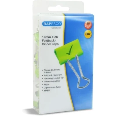 Rapesco 1421 19 mm Tick Foldback Binder Clips, Green, Pack of 80