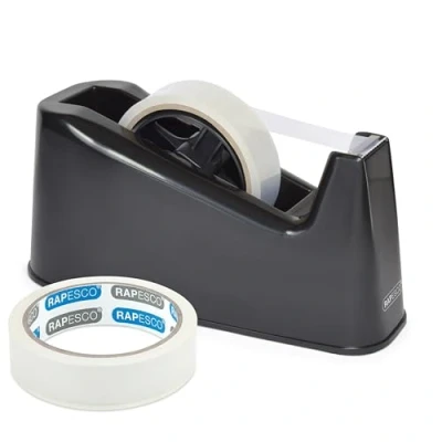HEAVY DUTY DESKTOP TAPE DISPENSER - 500 Tape Dispenser delivered with 2 x rolls of 25mm wide x 45m long clear transparent tape, ready to use right away COMPATIBLE WITH LARGE AND SMALL TAPES - Dual core facility allows use of both large and small tape rolls with 1" or 3" cores, accepts standard 33 m or 66 m tape reels with a 25 mm width SECURE ANTI-SLIP TAPING - Weighted tape dispenser with a non-slip base to ensure stability and prevent movement during repetitive taping jobs throughout the day EFFORTLESS ONE-HANDED USE - Features a sharp, serrated cutting edge for effortless one-handed use and keeps the end of the tape handy and ready-to-tear to save time from finding it CONVENIENT USE - Stylish black tape dispenser useful for gift wrapping for birthdays and Christmas, making collages for school projects, mending papers and small objects around the home or office, labelling boxes in retail and many more MEASUREMENTS - W-87 mm x D-212 mm x H-103 mm; Weight - 1.5 kg