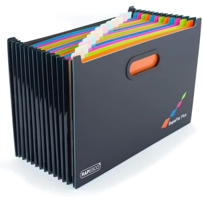 A4+ EXPANDING FILE - A4+ 13-section desktop expanding accordion file folder organiser in a black finish with carry handles and colourful internal section dividers LARGER SIZE - Perfect for storing documents of all sizes, accommodates files and folders wider than A4 (A4+ and foolscap); capacity of up to 1300 sheets of 80gsm paper (approx. 100 per section) EASY ORGANISATION - 13 concertina expanding sections separated with bright coloured dividers for thematic organisation and supplied with a set of blank index labels for easy customisation PORTABLE STORAGE - Solid construction able to stand up on its own, featuring reinforced cut-out handles that allow for easy transportation CONVENIENT USE - Practical landscape expanding file, ideal for shelf or desktop use, helpful in organising projects, dividing subjects, storing customer files and home filing DIMENSIONS - W – 385 mm x D – 260 mm (fully expanded) x H – 258 mm