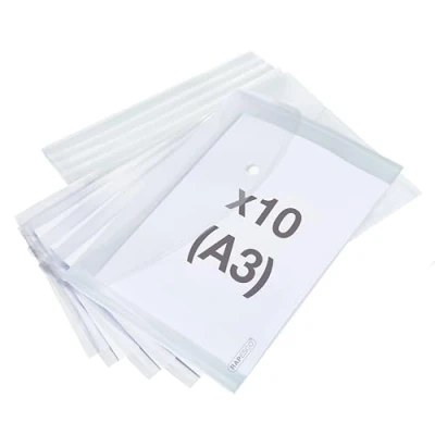 A3 POPPER WALLETS - Pack of 10 ECO recycled plastic folders in a clear transparent colour SUSTAINABLE - GRS certified wallet folders made from 100% post-consumer recycled polypropylene; Supplied in 100% recycled and recyclable packaging FEATURES - Durable 200-micron copy-safe polypropylene with a Superline finish, fold-over flap with white button closure, and a practical pen holder cut out under the flap LARGE CAPACITY - Capable of storing up to 75 sheets of 80 gsm paper up to A3 size EASY ORGANISATION - Crystal-clear, transparent material allows for quick and easy identification of documents, helpful in filing at the office, home or on the move DIMENSIONS - Each plastic wallet measures 2 mm or 7 mm including popper (depth) x 449 mm (width) x 325 mm (height)