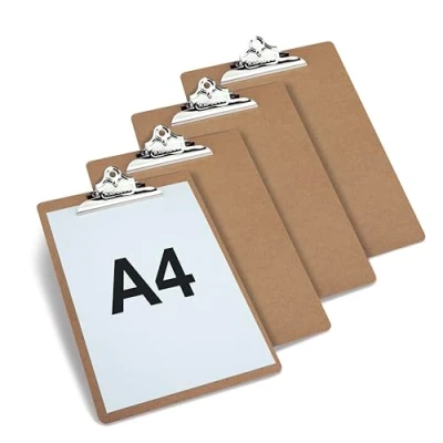 BUSINESS PACK - Practical pack of 4 A4 sized hardboard clipboards with a strong spring clip mechanism to hold documents securely LARGE CAPACITY - Sturdy metal, high-capacity chrome clip, holding up to 120 sheets of 80gsm paper at a time SMOOTH WRITING SURFACE - Durable high-density hardboard base with glazed finish providing a comfortable, smooth writing surface and rounded corners for an easy hold PORTABLE AND EASY STORAGE - Easy to hang using the hole on the clip and lightweight enough to carry in a rucksack, briefcase or by hand CONVENIENT USE - This multi-pack is useful for school projects and field trips, surveys and questionnaires, hospital records, memos, tickets, receipts, artwork, menus and much more DIMENSIONS - Each clipboard measures 228 mm (width) x 338 mm (height) x 35 mm (depth including clip) or 3 mm (depth excluding clip)