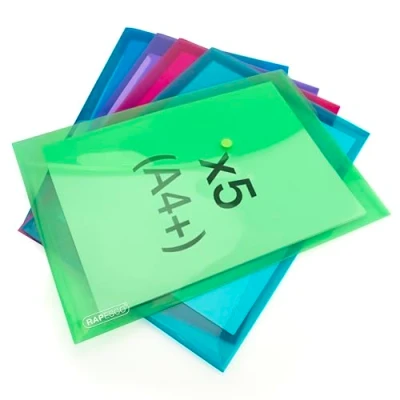A4+ POPPER WALLETS - Pack of 5 ECO recycled polypropylene folders in bright transparent colours SUSTAINABLE - GRS certified wallet folders made from 100% post-consumer recycled polypropylene material; Supplied in recycled and recyclable packaging FEATURES - 200-micron copy-safe polypropylene, fold-over flap with colour-coordinated press-stud closure, ‘Superline’ finish and a practical pen holder cut out under the flap LARGE CAPACITY - Capable of storing 150 sheets of 80 gsm paper up to A4+ in size EASY ORGANISATION - Assorted transparent colours allow for quick and easy identification of documents and colour-coordinated filing at the office, home or on the move
