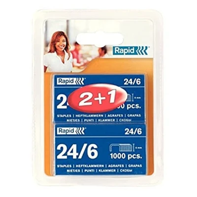 High quality standard staples for stapling up to 20 sheets (80gsm paper), Suitable for light duty stapling tasks in the office, at home or at school For use with desktop and electric staplers for trouble free, accurate stapling, Precision cut legs for optimum results Features a 6mm leg length, Made from soft galvanised steel for comfortable stapling Receive up to a 5 year guarantee on Rapid staplers when using compatible Rapid staples Contents: 3 x Boxes of 1000 Rapid 24/6mm Standard Staples, Galvanised Wire, Dimensions (WxHxD): 100 x 38 x 135mm, Weight: 160g, 20710621