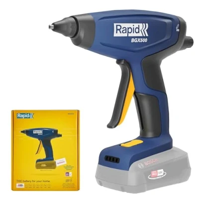 Quick warm up: The BGX500 has a quick 3-minute warm-up time, promising excellent efficiency when fastening cables and tackling a range of decorating jobs Adjustable flow: This cordless glue gun's unique flow adjuster allows you to tailor its operation to the unique needs of each job Exchangeable nozzles: The BGX500's exchangeable nozzles (sold separately) makes this hot glue gun highly versatile, and suitable for a wide range of applications Compatibility: The BGX500 recommended 2.5 Ah 18V battery (NOT included) is compatible with a range of tools from Rapid and other brands such as Bosch and Gardena High Quality For Best Results: We understand the importance of quality results and recommend using Rapid original consumables with your Rapid tools to achieve the best possible results